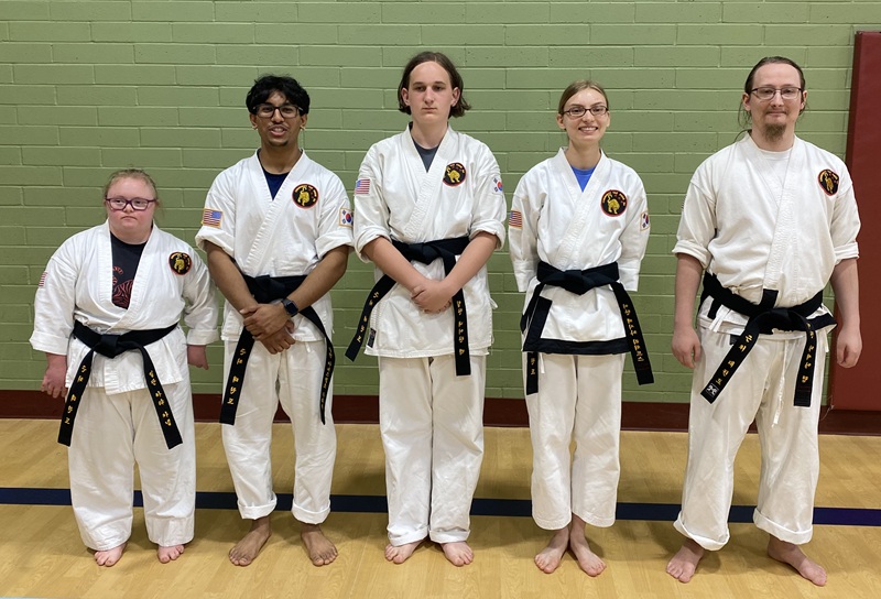 1st Degree Black Belts: Katya Conner, Abhishek Gahlaut, and Nathan Beck; 2nd Degree Black Belts: Jessica Richards and Izaiah Ham.